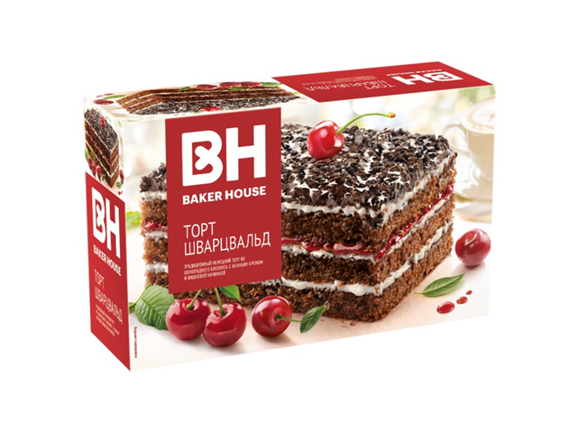 Торт «Шварцвальд происхождение которого придумано благодаря одноимённому региону Германии, который славился вишневым урожаем. Немецкий десерт от бренда BAKER HOUSE состоит из шоколадных коржей со взбитыми сливками и вишневой начинкой, украшенный шоколадной крошкой.