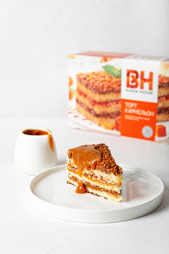 Торт «Кармельон» от бренда BAKER HOUSE представляет собой бисквитные коржи, пропитанные карамелью, покрытые нежным трюфельным кремом и густой молочной карамелью. Торт украшен карамелизированным дробленым арахисом.